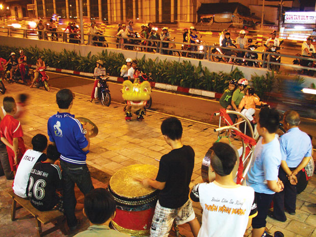 Cơn mưa đầu hôm vừa tạnh. Phố sá dịu hẳn. Nhưng con hẻm hẹp bên cạnh đình Vĩnh Hội, quận 8 vẫn nhếch nhác, ẩm thấp. Người ta thấy từ con hẻm đó, túa ra một nhóm hơn chục đứa trẻ lóc nhóc, đứa khệ nệ khiêng trống lân, đứa xách chũm choẹ, đứa vác đầu lân nói cười đùa giỡn, cắt qua dòng người xe nườm nượp đi về phía chân cầu Chà Và, trước toà nhà Prudential. Một lúc sau, tiếng trống rộn ràng vang lên cả góc phố, nhiều người dân chung quanh kéo đến, người đi đường hiếu kỳ dừng lại xem.