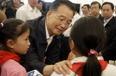 Hình ảnh cựu Thủ tướng Ôn Gia Bảo trong chuyến thị sát khắc phục hậu quả trận động đất tại Tứ Xuyên năm 2008 trên truyền thông nhà nước Trung Quốc.
