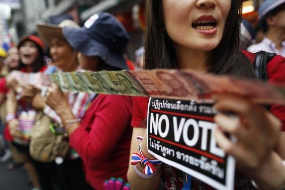 Những người biểu tình Thái Lan cầm miếng giấy ghi chữ “không bỏ phiếu” và tiền ủng hộ lãnh đạo lực lượng biểu tình hôm 1/2.