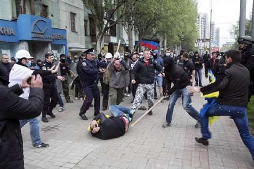 Người biểu tình ủng hộ Nga đụng độ với phe ủng hộ Ukraine tại Donetsk. Ảnh: Reuters