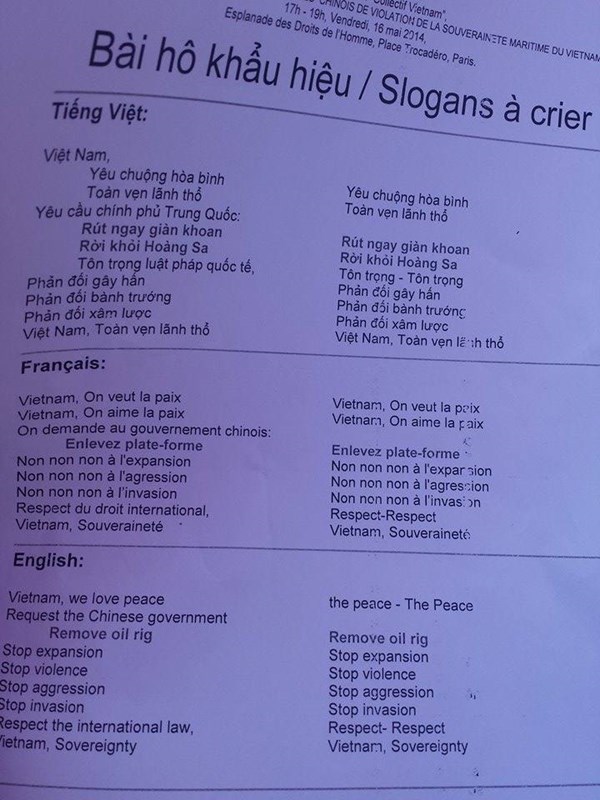 Chiều tối qua (giờ Paris), tại thủ đô Paris, Pháp, hàng ngàn người Việt Nam và bạn bè quốc tế đã tổ chức mít tinh, tuần hành phản đối việc Trung Quốc hạ đặt giàn khoan Hải Dương 981 trái phép trên vùng biển chủ quyền của Việt Nam. Chúng tôi giới thiệu chùm ảnh từ Paris.
