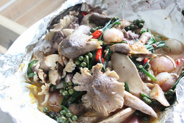 Nấm mối nướng giấy bạc với tiêu xanh cùng thịt bò