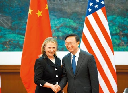 Bà Clinton bắt tay Ngoại trưởng Trung Quốc Dương Khiết Trì ở Bắc Kinh ngày 5/10/2012.
