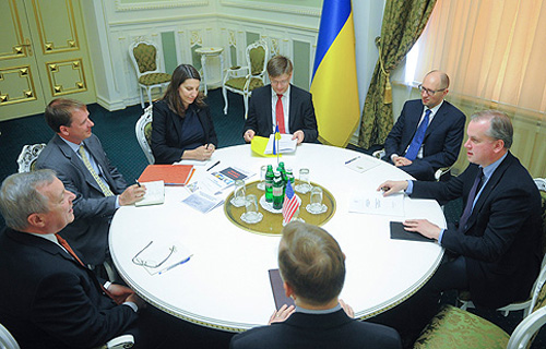 Thủ tướng Ukraine Arseniy Yatseniuk (đeo kính) trong cuộc gặp với TNS Mỹ Dick Durbin (đối diện) hôm 25/5. Ảnh: kmu.gov.ua