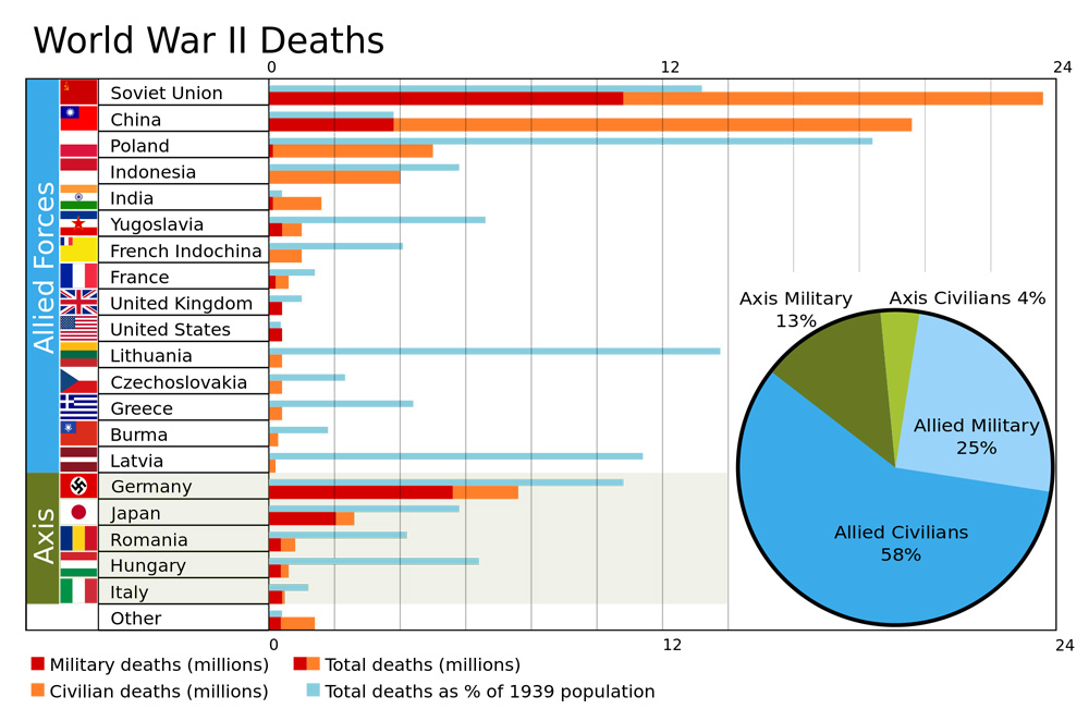 Tại mặt trận Xô - Đức. Đức đã tung 70% binh lực với các sư đoàn hùng mạnh và tinh nhuệ nhất cùng với khoảng 81% pháo, cối; 67% xe tăng; 60% máy bay chiến đấu. Ở hai bên chiến tuyến đồng thời hiện diện đến 12,8 triệu người, 163.000 khẩu pháo và cối, 20.000 xe tăng và pháo tự hành, 18.800 máy bay. Ngay cả sau khi Mỹ, Anh mở mặt trận thứ hai, Đức vẫn sử dụng gần 2/3 binh lực để chiến đấu với Liên Xô.