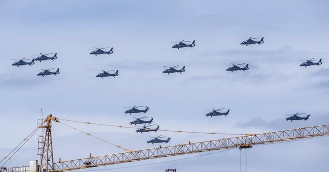 Trực thăng bay theo đội hình trên bầu trời Bắc Kinh, chuẩn bị lễ kỷ niệm kết thúc Đệ nhị Thế chiến, 12/06/2015. REUTERS/Stringer