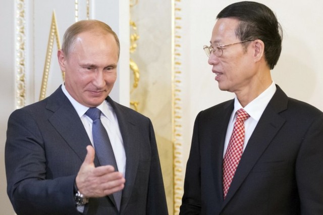 Tổng thống Nga Vladimir Putin gặp phó Thủ tướng Trung Quốc Trương Cao Lệ (phải) tại Diễn đàn kinh tế St. Petesburg. Ảnh: AFP.