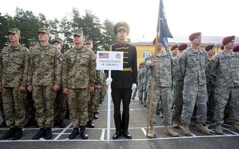 Binh sĩ Ukraine (trái) và lính dù Mỹ (phải) tại lễ khai mạc cuộc tập trận chung NATO mang tên Rabid Trident