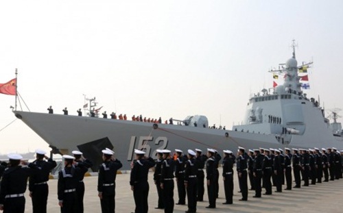 Hải quân Trung Quốc đứng cạnh tàu khu trục Jinan trở về cảng quân sự Zhoushan, tỉnh Zhejiang hồi tháng hai. Ảnh: Xinhua