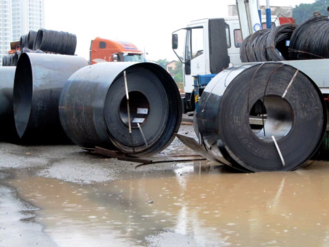 Do sụp “ổ voi” đầy nước, thùng xe tải bị xóc mạnh khiến xích buộc bị đứt, 3 cuộn thép lăn ầm xuống đường.