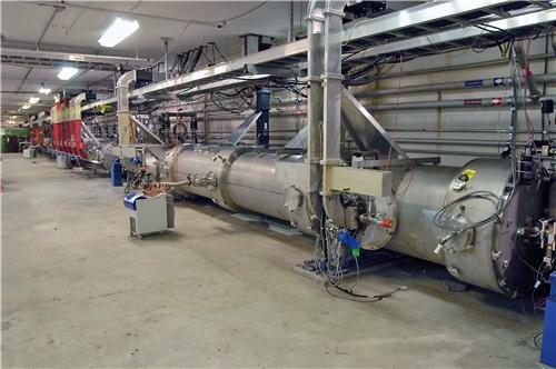 The free-electron laser produces laser light by accelerating electrons through these cryomodules and then into a wiggler, where electrons give off photons of light. Image courtesy: Greg Adams, Jefferson Lab.