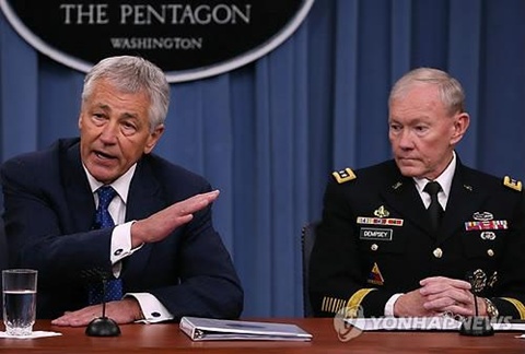 Bộ trưởng Quốc phòng Mỹ Chuck Hagel (trái) và Chủ tịch Hội đồng Tham mưu trưởng Liên quân Mỹ Martin Dempsey trong buổi họp báo hôm qua. Ảnh: Yonhap