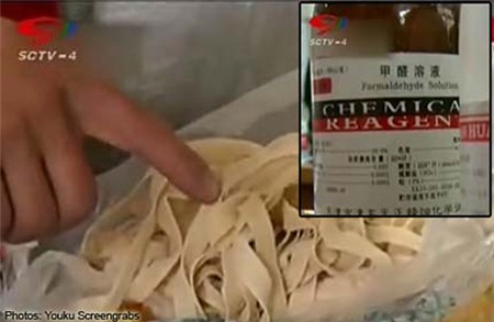 Cảnh sát Trung Quốc vừa bắt hai chủ cửa hàng vì sử dụng formaldehyde- một chất có thể gây ung thư và dị tật thai nhi - để giữ cho mỳ tươi ngon.