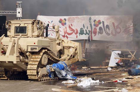 Xe ủi đi qua khu trại của những người biểu tình bị đốt cháy ở Cairo ngày 14/8. Ảnh: AFP/TTXVN