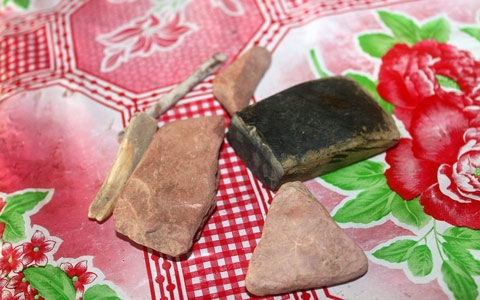 Rìu đá, thổ hoàng, xương thú được phát hiện tại di tích.