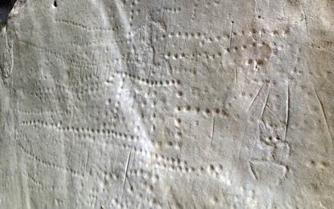 Bề mặt của phiến đá có nhiều hình tròn lõm được khắc theo một trật tự nhất định.