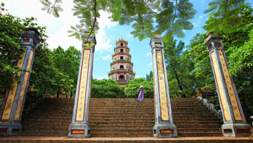 Không gian xanh mát ở chùa Thiên Mụ. Ảnh: dulichhue.com.vn