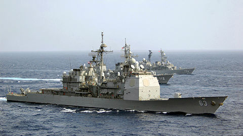 Tuần dương hạm USS Cowpens trong đội hình tác chiến. Được biết, đây là một chiến hạm giàu kinh nghiệm trận mạc, đã từng bắn gần 40 tên lửa Tomahawk trong cuộc chiến tranh Iraq