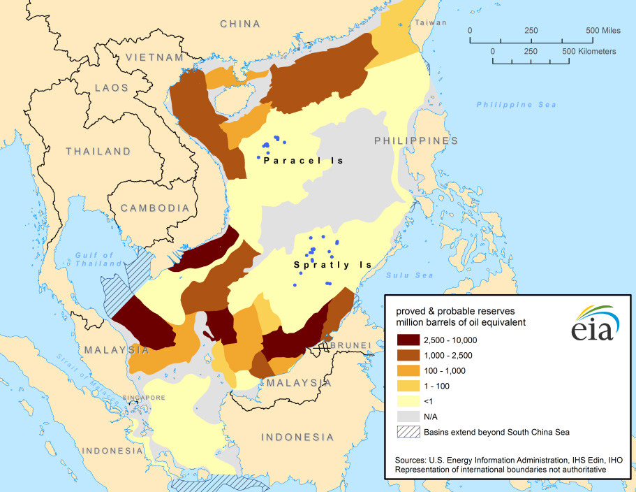 Phân tích của EIA cho thấy hầu hết các khu vực chứa dầu khí đã được phát hiện là các khu vực không có tranh chấp và ở gần bờ của các quốc gia ven biển. Nguồn tin công nghiệp cho thấy hầu như không có dầu và chưa đầy 100 tỷ feet khối (4 tỷ m3) khí đốt tự nhiên ở các khu vực gần quần đảo Trường Sa. Thậm chí, quần đảo Hoàng Sa chỉ có một ít khi đốt tự nhiên và hoàn toàn không có dầu mỏ.