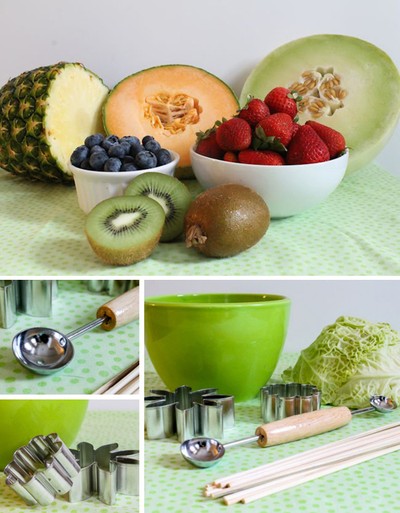 - Trái cây để cắm: ½ trái dưa lưới ruột màu cam, ½ trái dưa lưới ruột màu xanh nhạt, ½ quả dứa, 10 quả dâu tây, 2 trái kiwi… (bạn có thể sử dụng dưa hấu, nho).