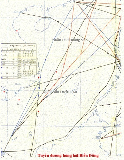 Trước hết, chúng ta cần biết đặc tính tự nhiên ảnh hưởng đến hàng hải qua biển Đông. Do đặc điểm dòng chảy và gió mùa, về mùa đông, tàu biển di chuyển từ phía Bắc xuống Nam biển Đông đều phải đi sát bờ biển miền Trung Việt Nam (đường màu xanh - hình dưới). Còn từ phía Nam lên hướng Bắc thì tàu biển phải tránh xa bờ miền Trung để tránh dòng nước ngược (đường màu đỏ).