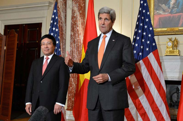 Tại cuộc gặp hai Bộ trưởng ngoại giao Phạm Bình Minh (Việt Nam) và John Kerry (Mỹ) ở Washington ngày 2.10.2014, Mỹ thông báo chính thức dỡ bỏ một phần lệnh cấm bán vũ khí sát thương cho Việt Nam, nước đối tác của Mỹ ở châu Á - Ảnh: Bộ Ngoại giao Mỹ