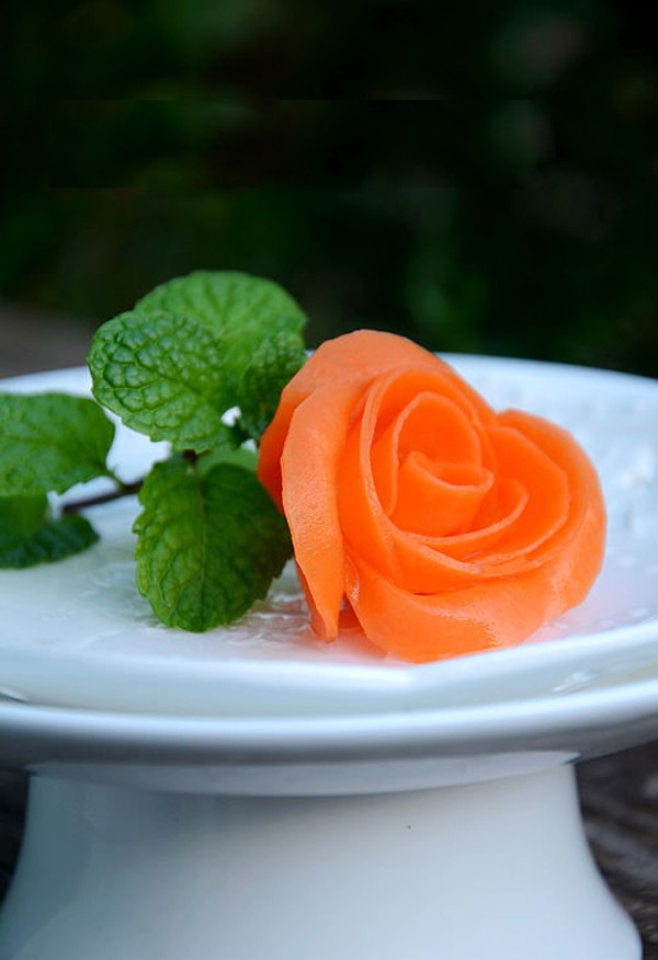 Vậy là bông hoa hồng đã hoàn thành! Trang trí bông hoa hồng trên chiếc đĩa trắng kèm theo cành lá bạc hà thành cành hoa hồng trông như thật. Cành hoa hồng sẽ giúp trang trí cho đĩa thức ăn thêm bắt mắt, hấp dẫn và ngon miệng hơn.