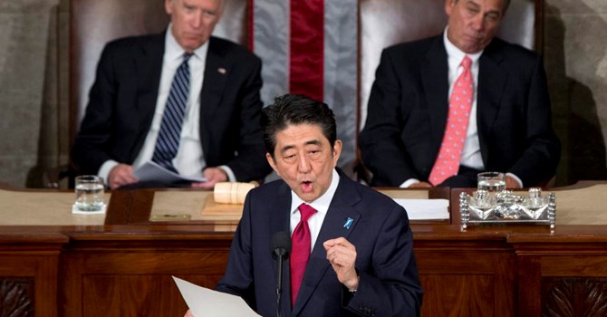 Thủ tướng Nhật Shinzo Abe phát biểu trước Quốc hội Mỹ. Ảnh Carolyn Kaster/AP