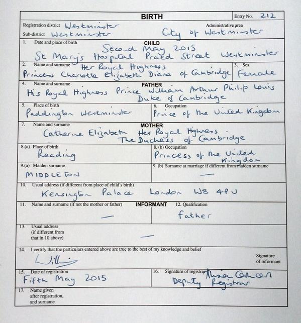 3 ngày sau khi chào đời, hoàng tử William đã làm giấy khai sinh cho con gái tại Cung điện Kensington, trước sự chứng kiến của bà Alison Cathcart – cán bộ phụ trách đăng ký giấy khai sinh của Hội đồng thành phố Westminster.