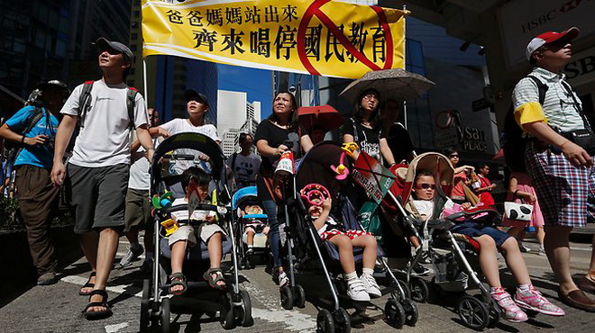 Hàng nghìn phụ huynh ở Hong Kong đã đẩy nôi xuống đường biểu tình ngày 29-7 phản đối một kế hoạch giới thiệu các bài học về lòng yêu nước dự kiến được đưa vào sách giáo khoa.