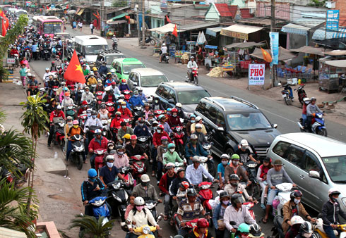 Trên xa lộ Hà Nội, cửa ngõ phía Đông của TP Sài Gòn, dòng người cũng ùn ùn đổ về thành phố. Từ 16h, lượng xe đi qua đây tăng đột biến. Trước khu du lịch Suối Tiên (quận 9), thời điểm người dân từ quê lên thành phố cũng là lúc nhiều người từ khu vui chơi ra về nên gây cảnh ùn ứ, các phương tiện phải chạy với tốc độ rất chậm.