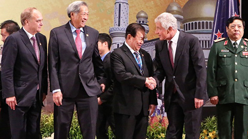 Bộ trưởng quốc phòng của các nước bắt tay nhau trong khuôn khổ Hội nghị Bộ trưởng quốc phòng ASEAN mở rộng, ngày 29/8/2013