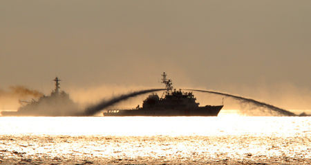 Tàu hải giám TQ bao vây và xịt vòi rồng vào tàu kiểm ngư VN. Ảnh: Hoàng Sang