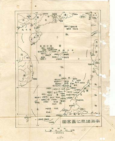 Bản đồ “Nam Hải chư đảo vị trí đồ” do Sở Phương vực (Trung Hoa Dân Quốc) biên soạn năm 1947 sau chuyến đi của Lâm Tuân. Bản đồ được vẽ và viết bằng tay. Đây là tiền thân của cái gọi là “đường chữ U” hiện nay - Ảnh: hudong.com