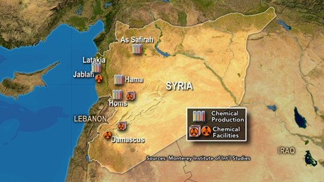 Bản đồ phân bố các cơ sở sản xuất và lưu trữ chất hóa học của Syria, theo nghiên cứu của Monterey Institute, Mỹ.
