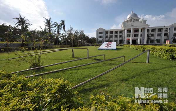 Cột cờ Trung Quốc trước trụ sở của cái gọi là "thành phố Tam Sa" mà Trung Quốc xây dựng phi pháp trên đảo Phú Lâm, Hoàng Sa cũng bị bão số 10 quật gẫy, áp phích trụ sở bất hợp pháp này cũng bị những cơn cuồng phong kéo sập.