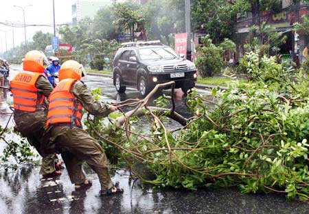 Lực lượng CSGT dọn dẹp cây xanh đảm bảo giao thông trên tuyến đường của TP Đà Nẵng. Ảnh: TTXVN.