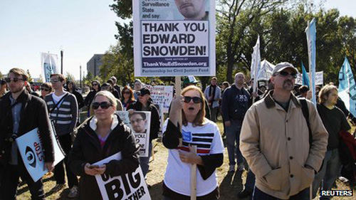 Ngày 26.10, hàng ngàn người đã biểu tình tại thủ đô Washington, yêu cầu NSA chấm dứt việc nghe lén và bày tỏ sự ủng hộ với Edward Snowden, người đã giúp vén bức màn bí mật việc nghe lén này.