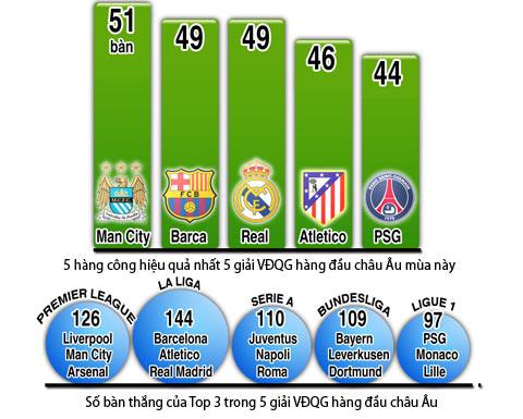 Xu hướng tấn công tại xứ sương mù đang giúp Man City đầy hy vọng phá kỷ lục về số bàn thắng một mùa giải trong lịch sử Premier League. Hiện kỷ lục này đang thuộc về Chelsea với 103 bàn mùa 2009/10. Với 51 bàn/17 vòng, Man City đang là đội ghi nhiều bàn nhất trong 5 giải đấu hàng đầu châu Âu và nếu giữ vững hiệu suất làm bàn như hiện tại, việc phá kỷ lục của Chelsea hoàn toàn nằm trong tầm tay thầy trò HLV Manuel Pellegrini.