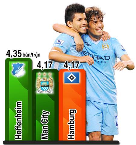 Man City đã ghi tới 51 bàn thắng, nhiều nhất Premier League mùa này. Nhưng ở khía cạnh phòng ngự, nửa xanh thành Manchester cũng để thủng lưới tới 20 bàn. Tấn công giỏi nhưng phòng ngự kém, Man City cống hiến những trận cầu nhiều bàn thắng nhất tại Premier League. Còn trên bình diện 5 giải hàng đầu châu Âu, họ chỉ thua Hoffenheim về số bàn thắng trung bình một trận.