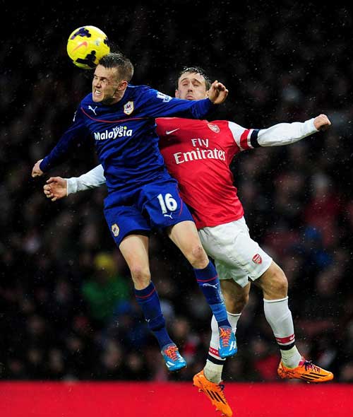 Buộc phải thắng để giữ ngôi đầu, HLV Wenger tung Rosicky, Bendtner vào sân để thay cho Flamini và Podoski. Tiếp tục là những tình huống nóng xuất hiện trước khung thành Marshall nhưng hệ thống phòng thủ chặt chẽ, bọc lót tốt của Cardiff đã ngăn cản các chân sút đội chủ nhà có tư thế dứt điểm thuận lợi. Khi mà ông Wenger đã nhấp nhổm đứng ngồi không yên ngoài đường piste, Arsenal bỗng có bàn thắng quý hơn vàng. Từ đường tạt cánh của Monreal, Sagna đánh đầu dũng mãnh khiến Marshall phải đẩy bóng ra. Ở góc hẹp, Bendtner rất nhanh tung người dứt điểm xé toang mành lưới đội khách. Niềm vui vỡ òa dù sau đó người hùng Bendtner phải rời sân do tiếp đất không tốt từ trên cao.