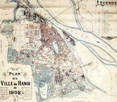 Bản đồ Hà Nội với cây cầu đầu tiên bắc qua sông Hồng được vẽ năm 1902 - thời kỳ hoàn thành xây dựng cầu Long Biên.