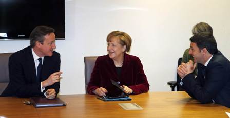 Từ trái sang phải: Thủ tướng Anh David Cameron, Thủ tướng Đức Angela Merkel và Thủ tướng Italy Matteo Renzi tại cuộc họp bất thường về tình hình Ukraine tại trụ sở EU ở thủ đô Brussels, Bỉ ngày 6/3. Ảnh: AFP-TTXVN