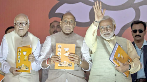 Ứng cử viên Thủ tướng của đảng BJP Narendra Modi (phải) ra tuyên ngôn đảng vào hôm 7-4 ở New Delhi. Ảnh: AP