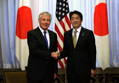 Bộ trưởng Quốc phòng Mỹ Chuck Hagel (trái) gặp Thủ tướng Nhật Bản Shinzo Abe tại thủ đô Tokyo ngày 5/4. Ảnh: AFP/TTXVN