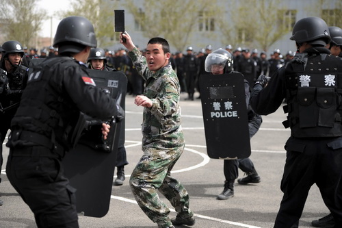 Cảnh sát chống bạo động Trung Quốc diễn tập chống khủng bố ở Tân Cương - Ảnh: Reuters