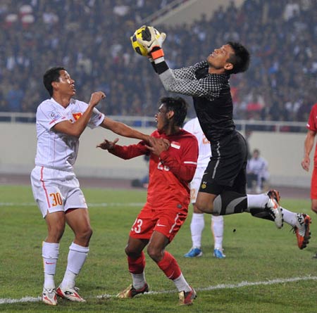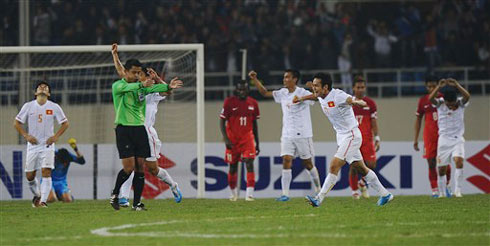 Singapore tấn công mạnh hơn ở cuối hiệp, nhưng vì thế họ đã để lộ nhiều khoảng trống và Việt Nam đã một lần chớp được thời cơ để tạo khác biệt. Phút 31 Việt Nam mở tỷ số bằng pha phản công sắc nét. Thành Lương nhận bóng bên cánh phải, bứt tốc hút các hậu vệ Singapore rồi chuyền rất thoáng sang mé trái cho Vũ Phong ập tới sút nhanh qua khe hai chân thủ môn Singapore lúc đó đã băng qua vạch 16m50 để cản phá. Pha phối hợp diễn ra rất nhanh và mềm mại, cú chuyền bằng chân trái của Thành Lương rất kín, khiến hệ thống phòng thủ của Singapore không kịp xoay trở. Giữa rừng người đứng bật dậy vui mừng hò reo trên sân Mỹ Đình có HLV Riedl. Ông trở lại đây với tư cách HLV trưởng Indonesia, theo dõi đối thủ có khả năng phải gặp ở bán kết (các trợ lý của ông xuống dự khán sân Thiên Trường, Nam Định). Indonesia nhất bảng A với thành tích toàn thắng.