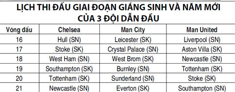 Bên cạnh khoảng cách về điểm số, bất lợi lớn nhất của Man United trong giai đoạn Premier League thi đấu dồn dập dịp Giáng sinh và Năm mới là lịch thi đấu của họ nặng hơn các đối thủ còn lại. Trong 6 vòng đấu tới Quỷ đỏ sẽ có 3 trận đấu khó khăn gặp Liverpool, Tottenham và Southampton. Ngoài ra, cuộc đọ sức với Newcastle ở vòng 18 cũng hứa hẹn không mấy dễ dàng. Chelsea dù không có lịch thi đấu “kinh hoàng” như Man United nhưng cũng chẳng mấy dễ chịu với những đối thủ như West Ham, Southampton, Tottenham. Trong khi đó, Man City được gặp những đội bóng ở cuối BXH kiểu Leicester, Crystal Palace… ở 5 vòng đấu tới.