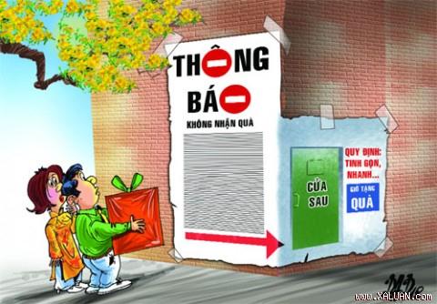 Lại nữa, ông Cục trưởng bảo phát hiện người nhận hay tặng quà tết trái quy định là  phải báo ngay. Ô hay, thế đúng quy định là như thế nào thì cũng phải công bố rõ ràng công khai cho dân biết. Chẳng hạn cấp nào được nhận hộp mứt tết, cấp nào được nhận hộp chè, chai rượu, con gà, gạo nếp, thịt lợn, đỗ xanh… Cứ y như tem phiếu thực phẩm thời bao cấp hồi xưa, công bố rõ ràng minh bạch hết cả ra để dân còn biết đường theo dõi.