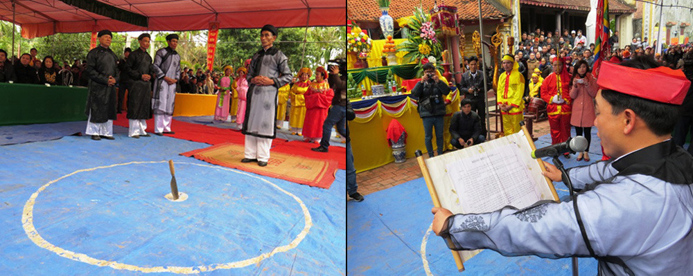 Sau mỗi hồi đọc là tất cả các vị "quan giả”, đều là những nông dân hàng ngày vẫn chân lấm tay bùn, bám đồng, bám ruộng tăng gia sản xuất đứng nghiêm trang, đồng thanh hô vang lời thề năm xưa của các bậc tiền nhân làm quan: “Ai dùng của công xây dựng việc công xin thần linh ủng hộ; ai lấy của công làm của tư xin thần linh đả tử;…”